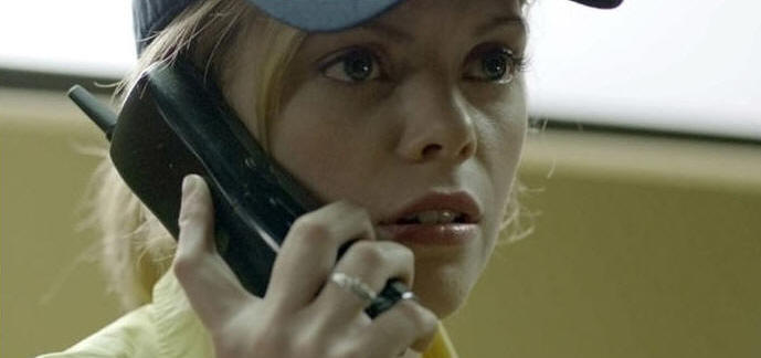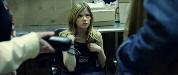 as Becky (on phone), under the watchful eye of Sandra (Ann Dowd) in "Compliance".