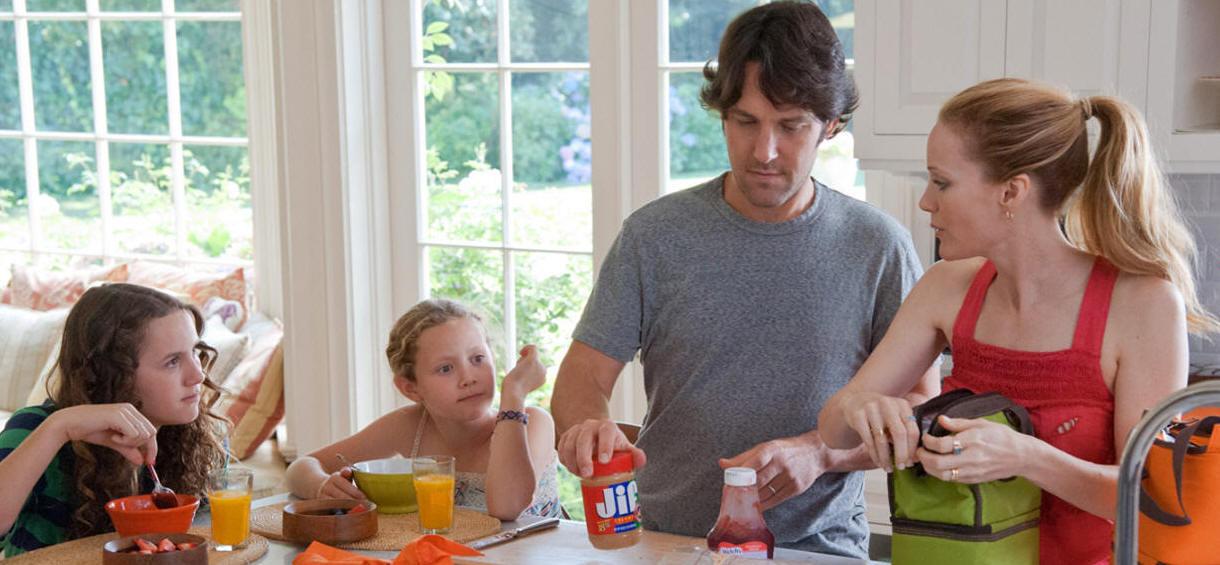 Maude Apatow, Iris Apatow, Paul Rudd, and Leslie Mann in Judd Apatow's comedy